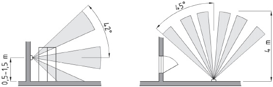 Oblast zachycení: přibližně kužel s vrcholovým úhlem 90°, dosah cca 40 m