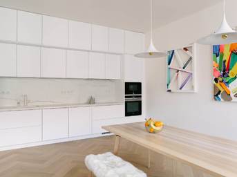 Vypínače a zásuvky z řady Decento perfektně zapadají do opticky čistého bytu, ve kterém se opakuje řada původních prvků s moderní reinterpretací pro život mladého páru ve 21. století. V koupelně tak vynikají zásuvky a vypínače vedle obkladu odkazujícího na původní dekor, zatímco v obývací části skvěle doplňují dřevěnou podlahu s nadčasovým vzorem rybí kosti.