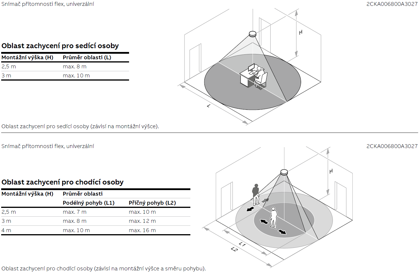 Oblast zachycení: kuželová (při montážní výšce 3 m je průmětem na podlahu kruh ∅ 10 m pro sedící osoby, ∅ 12 m pro chodící osoby)