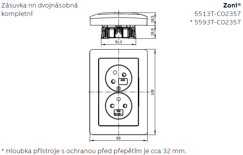 Zásuvka dvojnásobná s ochrannými kolíky, s clonkami, s natočenou dutinou, s ochranou před přepětím